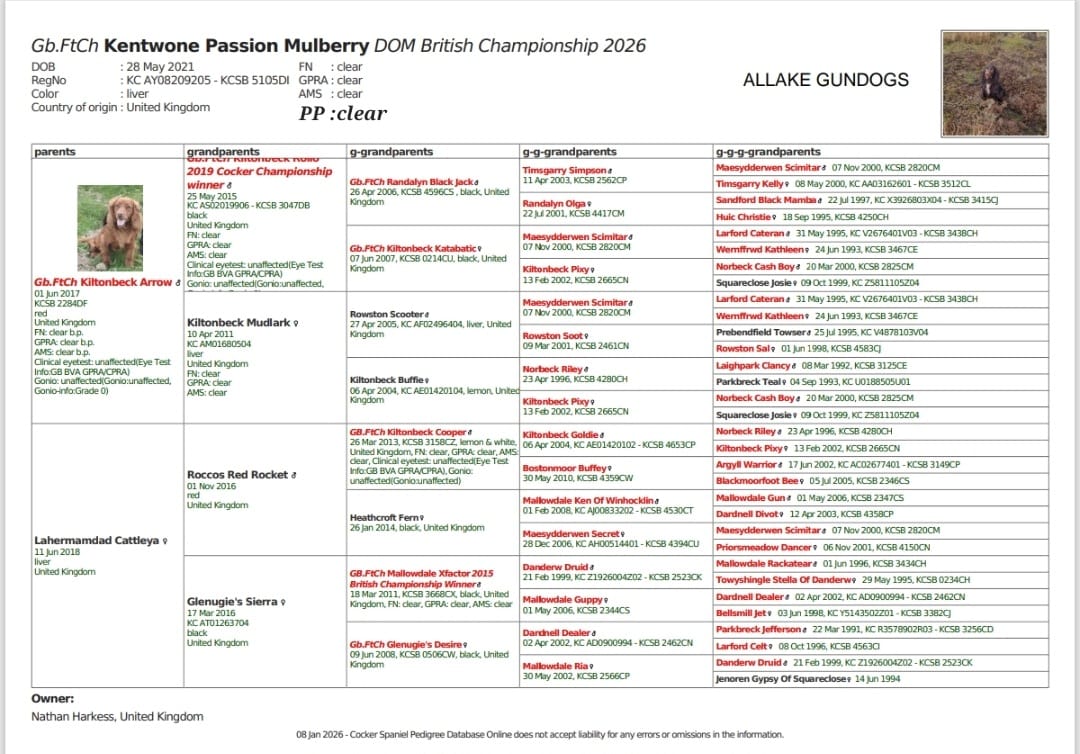 Woody is very honest and level headed small and compact dog with Great game finding abilities fearless in bramble  soft mouthed very honest and consistent Won hes novice in bramble and won hes open stake in bramble and made up to ftch in bracken  very hard going in cover  Aka the bramble basher Also gaining a D.O.M in the 95th cocker spaniel championship 2026 Also proven